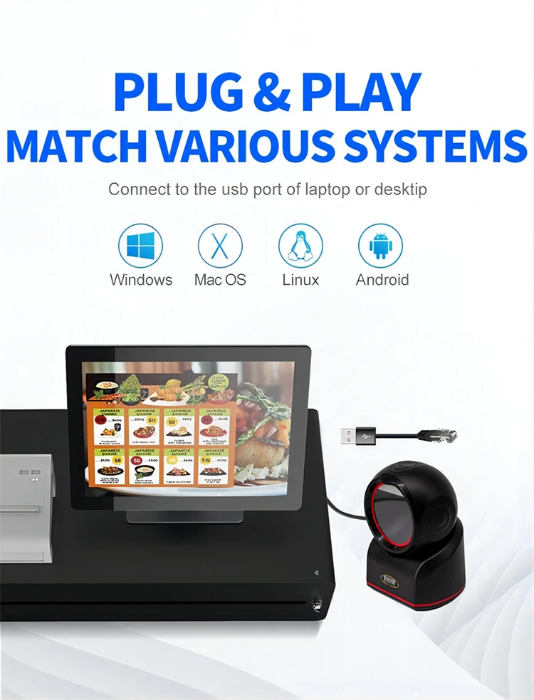 Незаменимият инструмент в търговията на дребно и ефективните гишета е компактен дизайн с голям прозорец за сканиране. Операторите не трябва да го държат; те просто трябва да подравнят баркода на продукта с прозореца, за да го идентифицират бързо. Това освобождава ръцете на оператора и подобрява ефективността на сканиране. Скенерът за баркод QR код поддържа режими на автоматично отчитане и ръчно задействане, като е бърз, без ръце и стабилен.